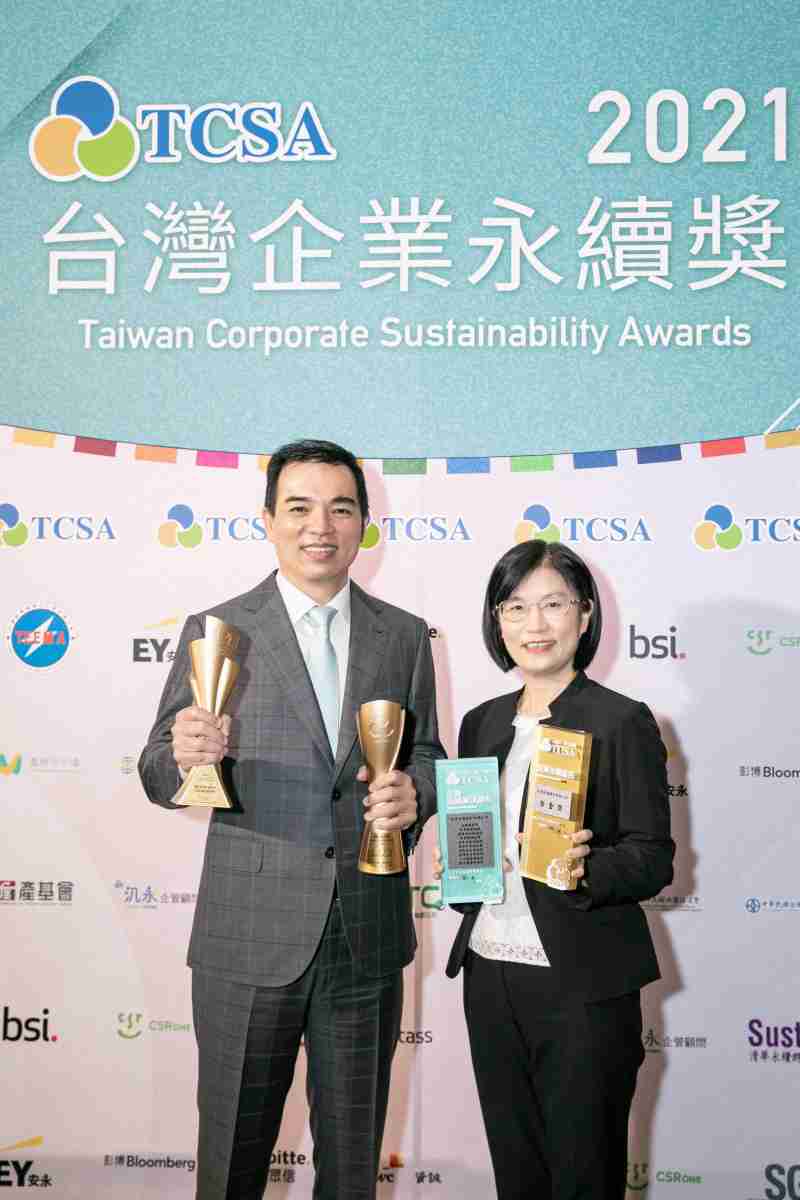 达在台湾永续奖所评比环境、、、、社会、、治理等各面向的永续绩效均获高度肯定 (左:尊龙z6光电总经理暨营运长柯富仁,,,右:尊龙z6光电永续长古秀华)