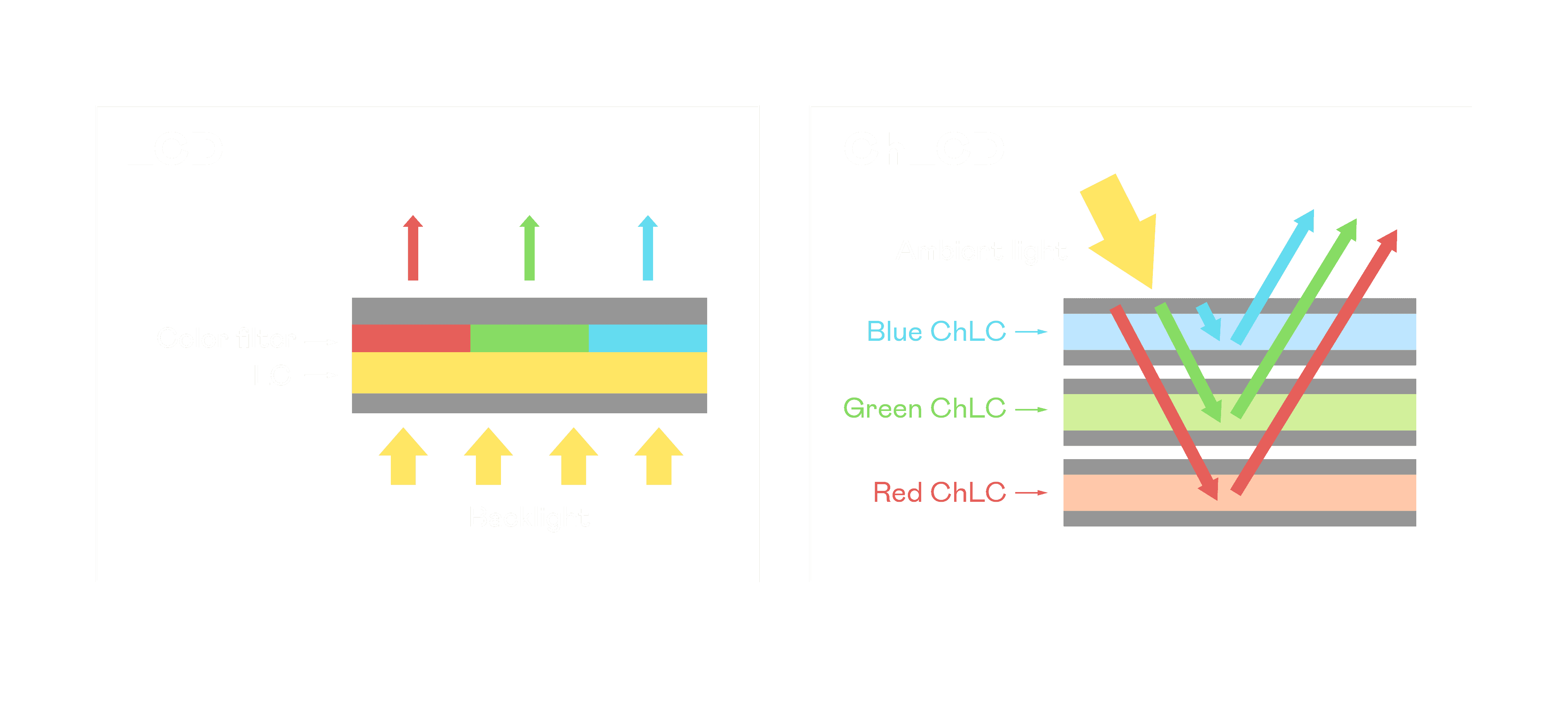 ChLCD 胆固醇液晶就如同纸张一样,,,,透过反射环境光来显示影像,,,,因此长时间观看不易造成人眼视觉疲劳,,,可达到护眼效果。。。当处于户外阳光下使用,,LCD 影像容易失真而不易观看,,但胆固醇液晶仍可维持较佳的影像品质。。